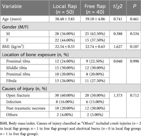 A total of 90 patients with lower limb bone exposure wounds were included in this study. They were divided into two groups based on the type of flap repair: the local flap group (n = 50) and the free flap group (n = 40). There were no statistically significant differences between the two groups in terms of general characteristics such as gender, age, BMI, location of bone exposure, and causes of injury (all P > 0.05), as shown in Table 1. The results indicate that the two groups are highly comparable.