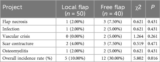 Analysis of complication incidence in the two groups revealed that, for individual complications, the rates of flap necrosis (7.50% vs. 2.00%), infection (5.00% vs. 2.00%), vascular crisis (5.00% vs. 0.00%), scar contracture (7.50% vs. 4.00%), and osteomyelitis (5.00% vs. 2.00%) were higher in the free flap group than in the local flap group, but these differences were not statistically significant (all P > 0.05) (Table 2). In terms of overall complication rates, the local flap group had a complication rate of 10.00% (5/50), which was significantly lower than the 30.00% (12/40) in the free flap group (χ2 = 5.802, P = 0.016) (Table 2), indicating that local flap transfer offers a superior advantage in controlling overall postoperative complications (Figure 1).