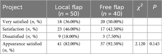 The assessment of cosmetic satisfaction at 1 year postoperatively showed (Table 3): the local flap group had a satisfaction rate of 82.00% (41/50), while the free flap group had a satisfaction rate of 92.50% (37/40). The satisfaction rate in the free flap group was slightly higher than that in the local flap group, but the difference was not statistically significant (χ2 = 2.120, P = 0.145). This indicates that there is no significant difference in the long-term aesthetic improvement outcomes between the two flap repair methods.