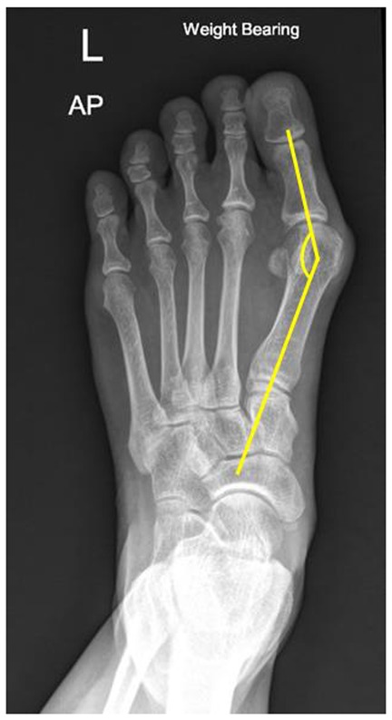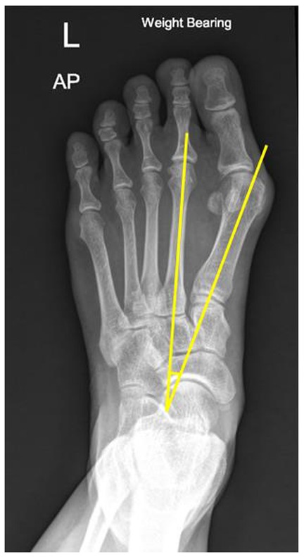 Figure 2. Illustration of HVA measurement in the weight-bearing plain film; the centres of the proximal and distal metaphyseal–diaphyseal areas of the proximal phalanx of the great toe were marked as the axis of the bone. The intersection of the 1st metatarsal and great toe proximal phalanx axes was defined as the hallux valgus angle.