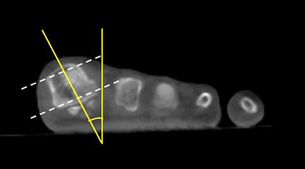 Figure 3. Illustration of α angle measurement in the weight-bearing CT scan; the dashed lines represent the referenced lines connecting the lateral and medial sulcus at the superior and inferior parts of the first metatarsal bone. The solid lines represent the α angle measurement as described.