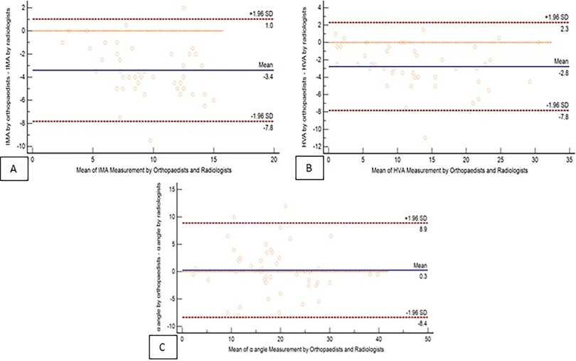 Figure 4. Interobserver reliability of parameter measurements: Bland–Altman plots comparing the parameter measurements obtained by orthopaedists and radiologists. The panels illustrate the agreement for three parameters: (A) IMA, (B) HVA, (C) α angle.