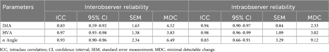 The average measurement of each parameter among the four readers was determined in terms of mean and standard deviation (SD) values. The clinical outcomes were categorised into two groups based on the normal or abnormal range of each parameter as defined previously (normal IMA < 9 degrees, normal HVA < 15 degrees, and normal α angle is between −4 and 18 degrees) (4, 11).