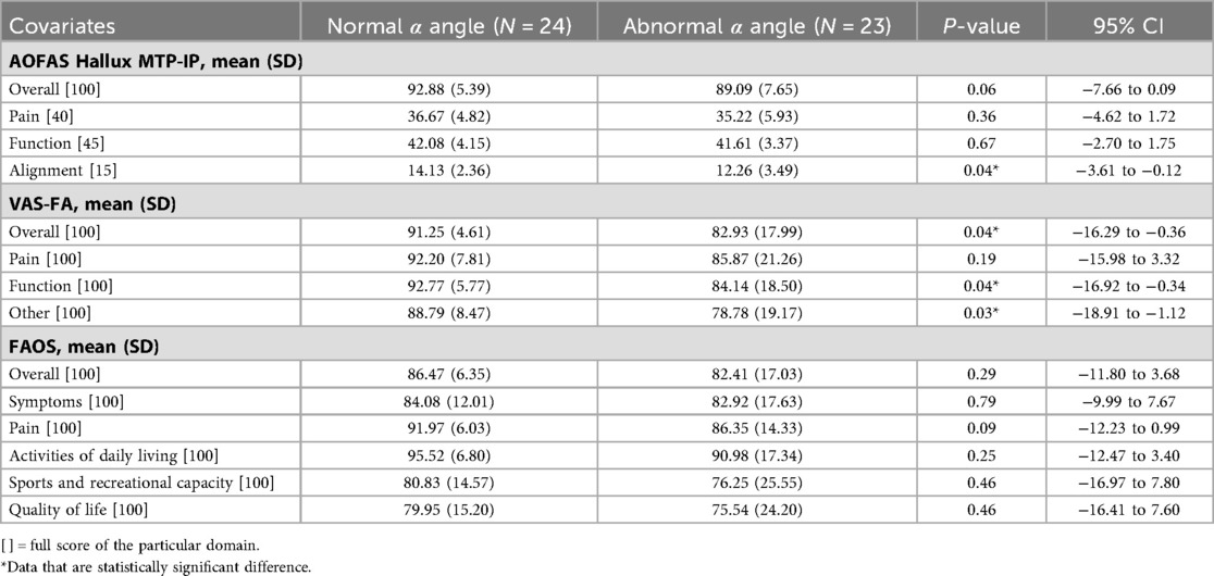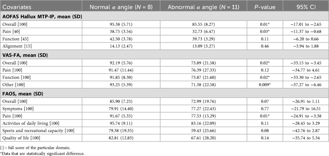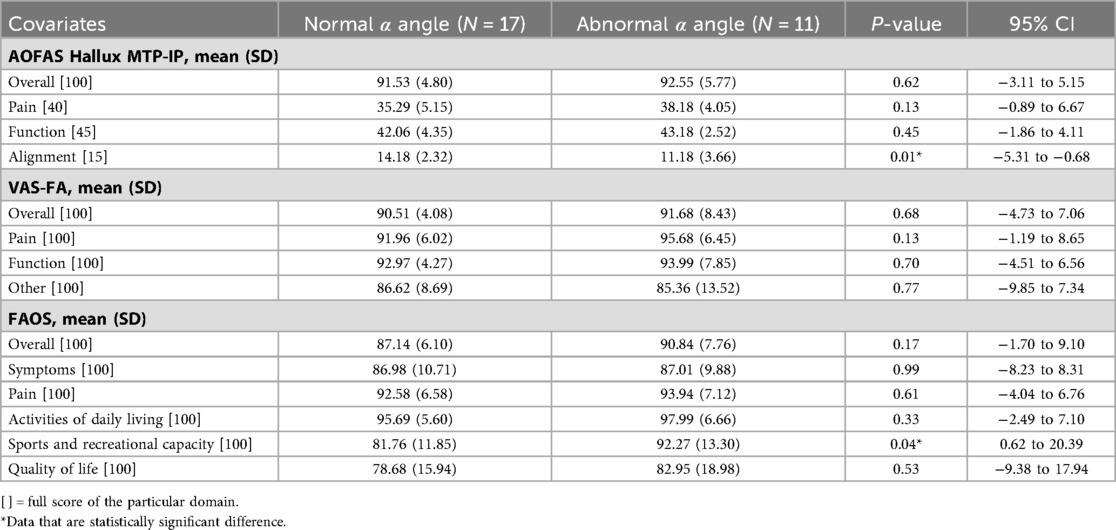 In the FAOS, the sports and recreational capacity subscale of the abnormal α angle group (mean, 92.27; SD, 13.30) was significantly better than that of the normal α angle group (mean, 81.76; SD, 11.85) (P-value = .04), while the overall score and remaining subscales did not show a statistically significant difference between groups.