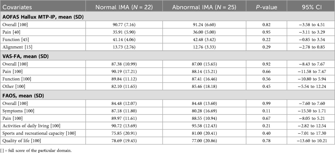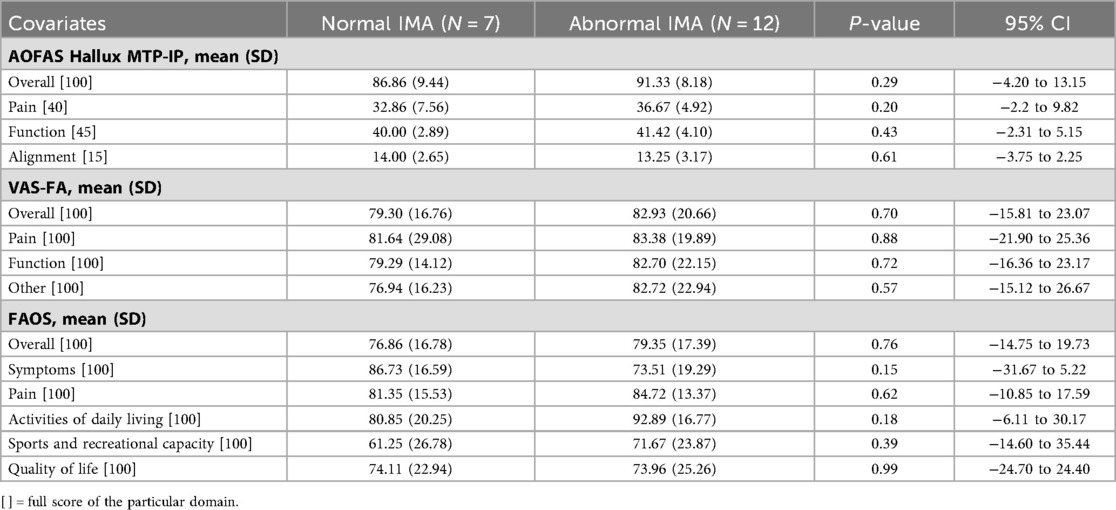 The AOFAS Hallux MTP-IP, VAS-FA, and FAOS were compared between groups with normal and abnormal IMAs (Table 9). The total score and subscales of all clinical outcomes were not significantly different between groups.