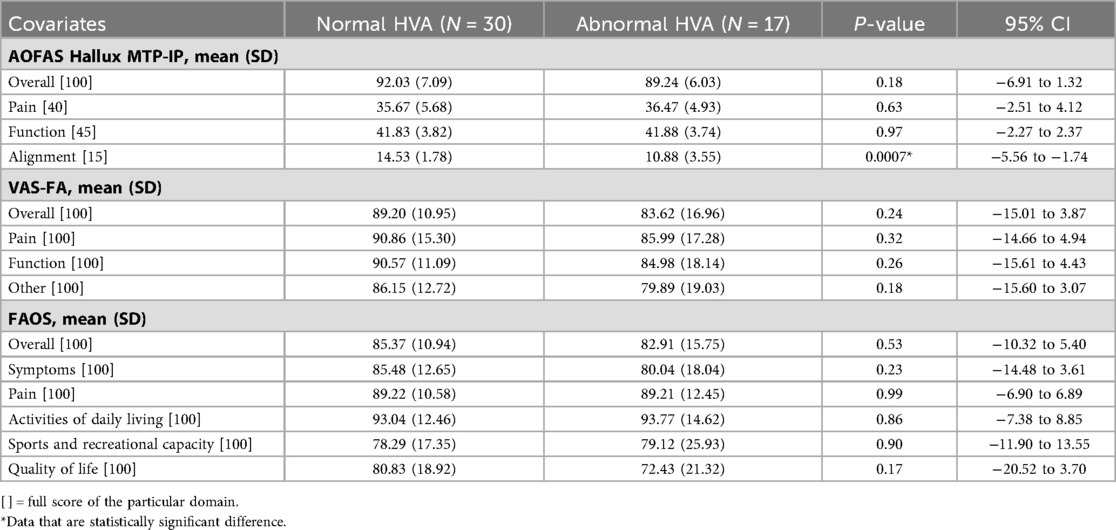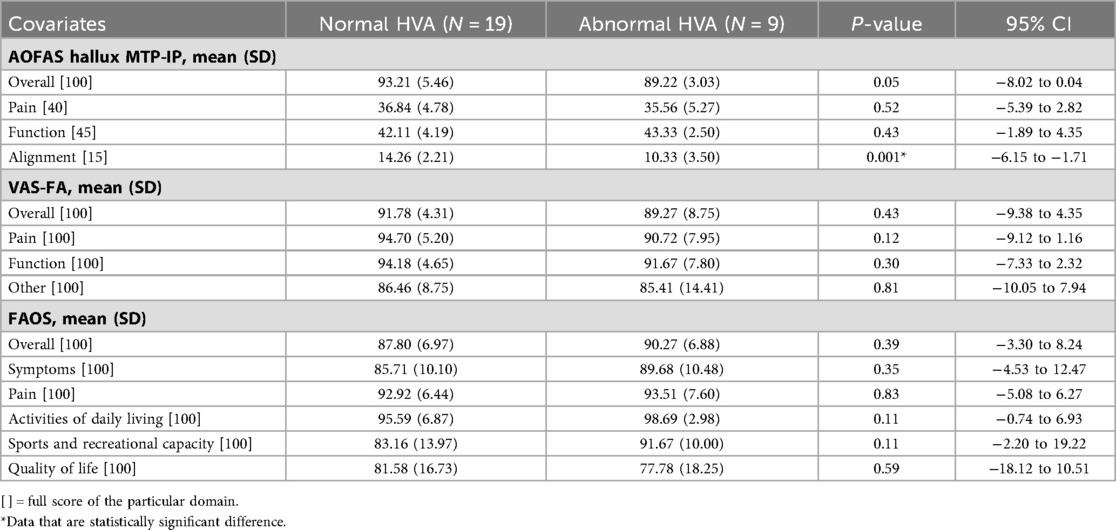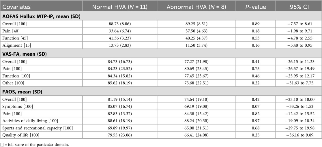 The alignment subscale of the AOFAS Hallux MTP-IP in the normal HVA group (mean, 14.53; SD, 1.78) was significantly better than that in the abnormal HVA group (mean, 10.88; SD, 3.55) (P-value = .0007). However, the overall score and other subscales of the AOFAS Hallux MTP-IP, as well as the overall score and subscales of the VAS-FA and FAOS, did not show a statistically significant difference between groups (Table 4).