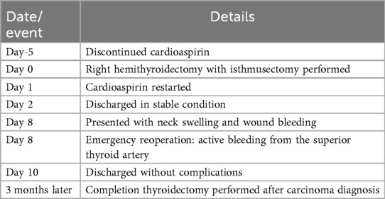 Although uncommon, late bleeding after thyroidectomy has been described in several reports. Calò et al. (34) reported two cases of bleeding on postoperative day 13 in patients treated with low-molecular-weight heparin. Lang et al. (11) analyzed over 5,900 thyroidectomies and found that approximately one-quarter of hematomas occurred >6 h postoperatively, with a minority presenting after 24 h. Burkey et al. (8) and Godballe et al. (24) also included delayed hematomas in their series, while Campbell et al. (35) confirmed that rare events can occur days after discharge. More recently, pseudoaneurysms of the superior thyroid artery have been described as causes of delayed bleeding (19, 36). In addition, randomized trials and observational studies investigating the perioperative management of aspirin therapy occasionally reported late hematomas as secondary outcomes (29, 30). These reports confirm that delayed postoperative hematoma, though exceptional, is a recognized phenomenon and should be considered in patients undergoing thyroidectomy, particularly those resuming antiplatelet or anticoagulant therapy.
