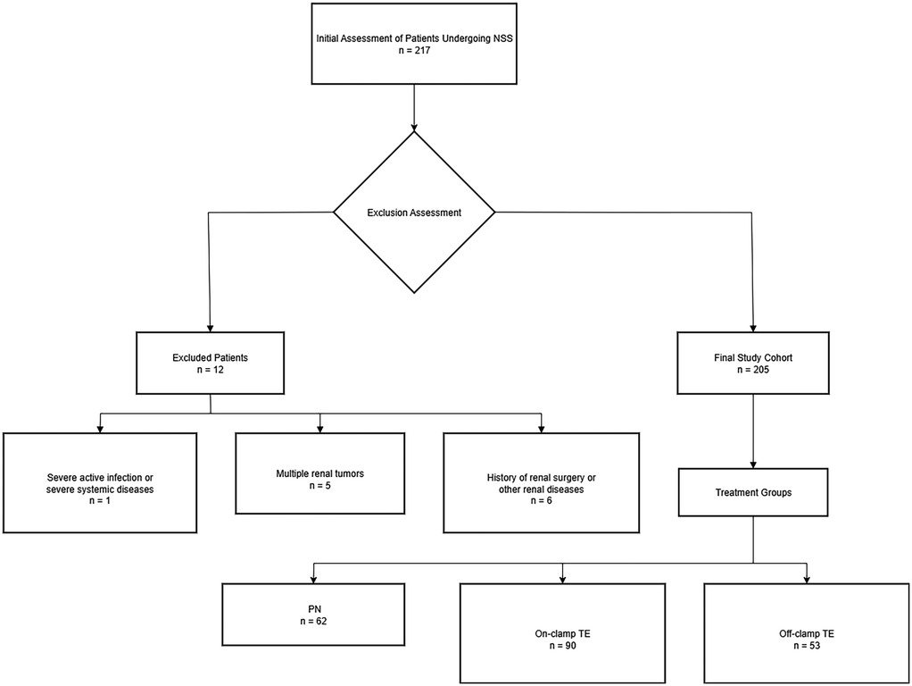 The study traced all patients with solid renal tumors who underwent NSS performed by one surgeon from 2017 to 2022. 217 patients were enrolled consecutively,after excluding cases that did not meet the requirements, 205 patients were selected (Figure 1). Dedicated genitourinary pathologists performed all the pathological analyses, including margin status and width. A negative surgical margin was defined as the presence of an intact tumor pseudocapsule with or without a quantifiable rim of the normal parenchyma (Supplementary Figure S1). The study followed the STROBE guidelines for reporting, ensuring the transparency and completeness of the observational research.