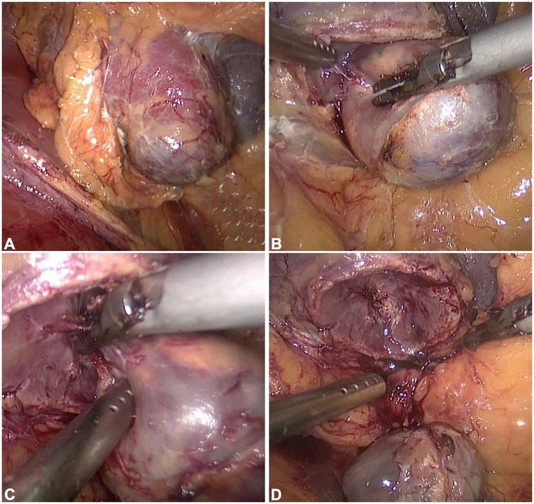 Figure 2. Key procedural steps in off-clamp tumor enucleation. (A) Tumor exposure. (B) Tumor resection. (C) Identification and coagulation of tumor-feeding vessels. (D) Resultant wound bed following tumor excision. As depicted, when tumors are superficially positioned and dissection is meticulously performed along the pseudocapsular plane with precise ligation of feeding vessels, intraoperative blood loss remains minimal throughout the procedure.