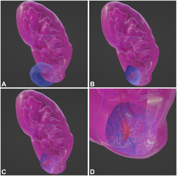 First, it is necessary to collect the original data of renal artery-enhanced CT for each patient and then perform three-dimensional reconstruction to generate a three-dimensional representation. Similarly, three-dimensional imaging data of the tumor were obtained using medical imaging techniques. Subsequently, image segmentation algorithms were applied to extract the tumor from the image, yielding a three-dimensional tumor model. Next, the kidney organ model and tumor model were registered to ensure that they were in the same coordinate system. The contact surface between the tumor and kidney can be determined by calculating the intersection between the organ and tumor models. The contact surface area (CSA) between the tumor and kidney was quantified using surface mesh analysis of the geometric interface. This involves partitioning the contact surface into small triangular elements and summing their individual areas (Figure 3).
