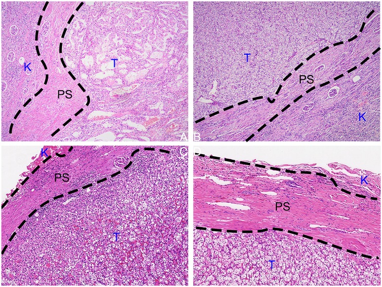Figure 4. HE-stained tissue sections cut from formalin-fixed paraffin-embedded specimens from the tumor-kidney boundary. (A,B) PN postoperative specimen. (C,D) TE postoperative specimen. (K, kidney; PC, pseudocapsule; T, tumor; F, perirenal fat).