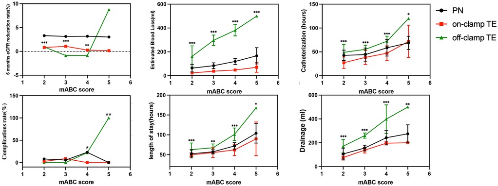 Results: Despite no statistical differences in demographic data, we found that the off-clamp tumor enucleation (TE) group experienced greater estimated blood loss, drainage, catheterization, and longer hospital stays compared to the other two groups. However, this group also had shorter surgical times and less kidney function impairment, particularly in patients with renal dysfunction. Subgroup analysis indicated that when the mABC score was ≥4, patients in the off-clamp TE group showed significant increases in the rate of reduction in eGFR, blood loss, postoperative complications, postoperative drainage volume, and postoperative hospital days compared to patients in the other two groups.