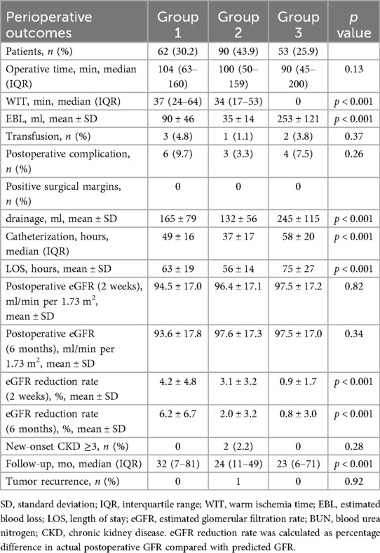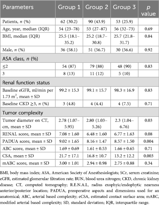 A total of 205 patients meeting the inclusion criteria for the study were divided into three groups based on the type of surgery they underwent. The groups were Group 1 (PN, 62 cases; 30.2%), Group 2 (on-clamp TE, 90 cases; 43.9%), and Group 3 (off-clamp TE, 53 cases; 25.9%). Baseline data of the study population are shown in Table 1. There were no statistically significant differences between the groups in terms of age, body mass index (BMI), sex, or ASA classification. There were also no statistically significant differences in the baseline renal function between the groups. The RENAL scores were 7.08 ± 1.60 (Group 1), 6.48 ± 1.60 (Group 2), and 6.77 ± 1.63 (Group 3) (p = 0.08). The PADUA score for Group 1 was higher than that of the other two groups (9.02 ± 1.65, 8.16 ± 1.47, and 8.57 ± 1.50, respectively; p = 0.004). The median tumor diameter in Group 3 was smaller than the other two groups (2.78 cm, 2.80 cm, and 2.30 cm for Groups 1, 2, and 3, respectively, p = 0.03). The tumor contact surface area (CSA) in Group 3 was lower than that in the other two groups (21.7 ± 17.1, 16.8 ± 10.7, and 13.2 ± 12.2, respectively; p = 0.003). There were no statistically significant differences between the groups in terms of ABC score (1.69 ± 0.69, 1.61 ± 0.53, 1.66 ± 0.65, respectively; p = 0.71) and mABC score (3.11 ± 1.13, 2.98 ± 0.98, 2.85 ± 0.91, respectively; p = 0.52).