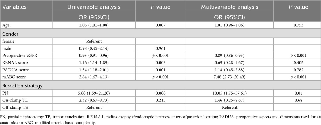 Logistic regression analysis was used to explore the factors affecting renal function (Table 3). In the univariate regression analysis, patients’ age (OR 1.05, 95%CI 1.01–1.08; p = 0.007), preoperative eGFR (OR 0.93, 95%CI 0.91–0.96; p < 0.001), RENAL score (OR 1.46, 95%CI 1.14–1.89; p = 0.003), PADUA score (OR 1.54, 95%CI 1.18–2.01; p = 0.001), mABC score (OR 2.64, 95%CI 1.67–4.13; p < 0.001), and surgical approach (OR 5.80, 95%CI 1.59–21.20; p = 0.008) were significantly associated with postoperative long-term renal function decline. After removing irrelevant factors, we further conducted a multivariate regression analysis, and the results showed that: patients’ preoperative eGFR [odds ratio [OR] 0.89, 95% confidence interval [CI] 0.86–0.93; p < 0.001], mABC score (OR 7.48, 95%CI 2.73–20.49; p < 0.001), and surgical approach (OR 10.05, 95%CI 1.75–57.61; p < 0.001) were associated with renal function preservation in patients. In conclusion, we have three main findings: patients with abnormal preoperative eGFR, higher mABC scores, and those undergoing PN surgery experienced more severe postoperative renal function damage. Additionally, we analyzed the factors related to postoperative complications (Supplementary Table S2), and the results showed that the higher the mABC score (OR 2.93, 95%CI 1.26–6.83; p = 0.013) and the lower the preoperative eGFR level (OR 1.08, 95%CI 1.01–1.16; p = 0.024), the higher the incidence of postoperative complications. Furthermore, based on the data from Supplementary Tables S3, S4, the mABC score (OR 5.45, 95%CI 2.92–10.18; p = 0.001) was a risk factor for operative time, and the mABC score (OR 5.14, 95%CI 266–9.99; p = 0.001) and off- clamp TE were risk factors for length of hospital stay.