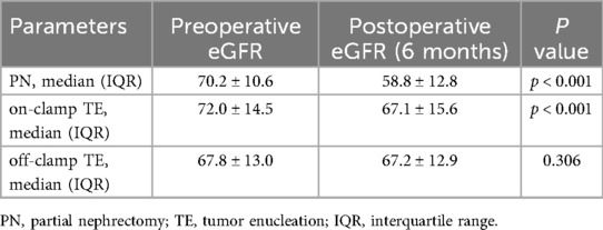 We found from the above results that the preoperative eGFR level is closely related to the postoperative outcome. Therefore, we specifically selected patients with preoperative eGFR abnormalities (≤90 ml/min/1.73 m2) for paired comparisons (Table 4). The results showed that postoperative eGFR levels of PN (p < 0.001) and on-clamp TE (p < 0.001) were significantly lower than preoperative levels, whereas off-clamp TE showed no significant change in postoperative long-term eGFR levels (p = 0.306). We further compared patients with poor preoperative renal function according to surgical method (Supplementary Table S5). At 2 weeks postoperatively, the eGFR reduction rate in off-clamp TE patients was significantly lower than that in on-clamp and PN patients (7.7%, 8.8%, and 2.7%, respectively; p = 0.001). At 6 months postoperatively, the eGFR reduction rate in on-clamp and off-clamp TE was significantly lower than that in PN (12.2%, 7.2%, and 2.0%, respectively; p < 0.001). In short, in the absence of other factors, patients with preoperative eGFR abnormalities receiving off-clamp TE surgical methods could better protect their renal function.