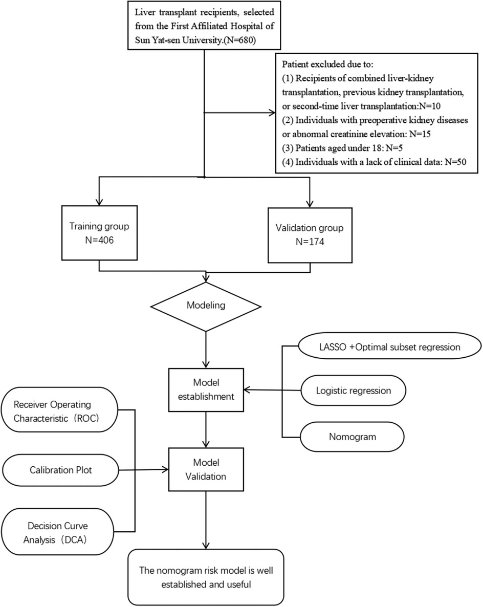 Flowchart depicting the selection and modeling process of liver transplant recipients from Sun Yat-sen University. Out of 680 patients, exclusions were made for specific medical conditions and insufficient data, resulting in 406 in the training group and 174 in the validation group. The model establishment involves LASSO, optimal subset regression, logistic regression, and nomogram. Model validation uses ROC, calibration plot, and decision curve analysis, leading to a well-established nomogram risk model.