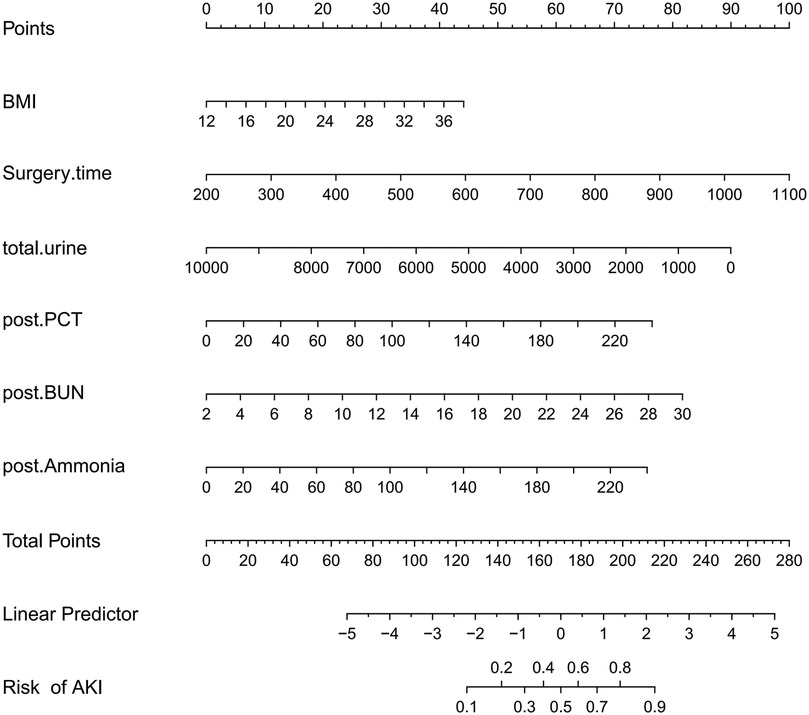 Figure 3. A risk factors of BMI, surgery time, total urine, postoperative PCT, postoperative BUN, postoperative ammonia for nomogram prediction model.
