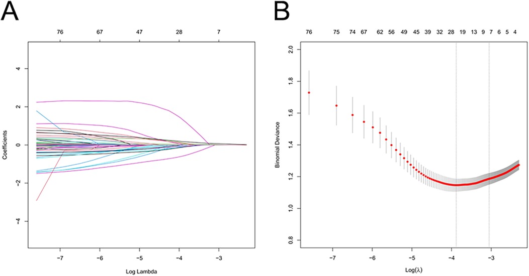 Graph A shows a line plot of coefficients against log lambda, displaying multiple lines that converge towards zero as lambda increases. Graph B plots binomial deviance against log lambda, with a curve decreasing to a minimum before rising, suggesting an optimal lambda range marked by vertical lines.