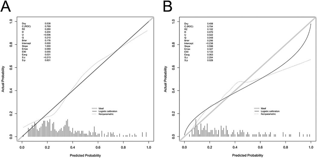 Two calibration plots labeled A and B compare actual vs. predicted probabilities. Both plots display ideal, logistic, and nonparametric curves. Insets provide statistical metrics including Dxy, ROC, R2, and more, alongside histograms showing distribution. Panel A shows closer alignment to the ideal line than panel B.