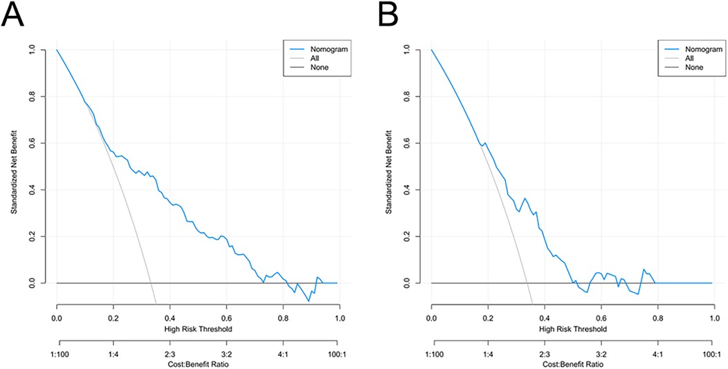 Figure 6. Decision curve analysis for the AKI risk nomogram. The y-axis measures the net benefit. The thick solid line represents the assumption that all patients do not have AKI, the thin solid line represents the assumption that all patients have AKI, and the blue line represents the risk nomogram. (A) originates from the training group, and (B) originates from the validation group.
