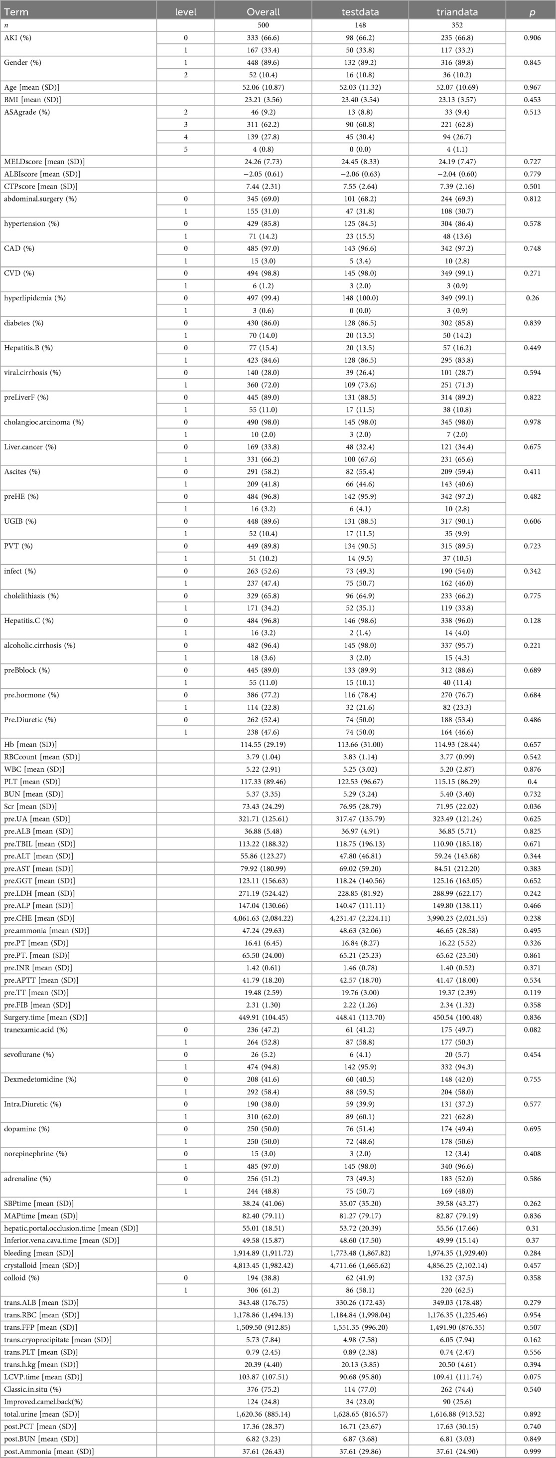 Currently, there are many research on novel biological markers related to renal function and kidney injury such as NGAL, KIM-1, and Cystatin C (15). However, for ESLD patients, there's a lack of biochemical indicators with high sensitivity, strong specificity, and broad clinical applicability for renal function assessment. Therefore, early identification and diagnosis of postoperative AKI and immediate therapeutic measures can be crucial to improve patient prognosis (16). Therefore, to aid clinicians in early identification and risk stratification during the perioperative period, and enable effective intervention targeting various high-risk factors, it is essential to develop an accurate model for predicting the occurrence of AKI. This study aims to investigate the risk factors of OLT-AKI through a retrospective analysis of the clinical data of 500 OLT patients, based on the KDIGO diagnostic criteria. The objective of the prediction model was to achieve early individualized assessment of the risk of developing OLT-AKI.