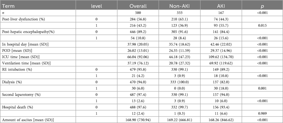 From January 1, 2016 to April 30, 2022, our hospital had a total of 500 patients undergoing LT. Based on the inclusion criteria, a total of 500 patients were added into the analysis, with 352 in the training group and 148 in the validation group. The detailed flowchart is shown in Figure 1. The overall characteristics of the two groups of patients are summarized in Table 1. In the training and validation cohorts, postoperative AKI occurred in 117 patients (33.2%) and 50 patients (33.8%) respectively. For analysis of postoperative characteristics and outcomes, patients were divided into two groups: AKI group and non-AKI group (Table 2). Compared to the non-AKI group, patients in the AKI group were more likely to undergo dialysis, had higher chances of reintubation, a higher mortality rate, prolonged hospital stay, prolonged postoperative ICU stay, longer duration of mechanical ventilation after surgery, and prolonged postoperative hospitalization. The likelihood of postoperative liver dysfunction and the incidence of hepatic encephalopathy had also increased. (P < 0.05).