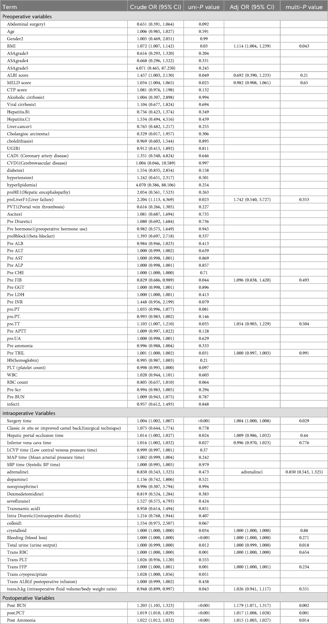 AKI was diagnosed using KDIGO criteria based on serum creatinine changes within 7 days post-transplantation. Because urine output data were not consistently available, the KDIGO urine output criterion was not applied; thus, intraoperative urine volume was analyzed as a perioperative variable rather than part of the AKI definition.MELD, ALBI, and CTP scores were utilized to evaluate end-stage liver disease (18). The ALBI (Albumin–Bilirubin) score is an objective indicator reflecting liver synthetic and excretory function, calculated from serum albumin and total bilirubin, and is considered a simple and reproducible index for grading liver function without subjective parameters (19). The Child–Turcotte–Pugh (CTP) score, which incorporates serum bilirubin, albumin, INR, ascites, and encephalopathy, has been widely used to assess hepatic reserve and predict postoperative outcomes (20). In addition to the MELD score, which mainly reflects liver disease severity and short-term mortality risk, the inclusion of ALBI and CTP scores provides a more comprehensive assessment of hepatic functional reserve, thereby improving the accuracy of preoperative evaluation (21). MELD = 3.8 × Ln(TBIL) + 9.6 × Ln(SCr) + 11.2 × Ln(INR) + 6.4 × etiology (0 for alcoholic and cholestatic liver disease, 1 for others), ALBI = (log10 bilirubin × 0.66) + (albumin × −0.085), CTP = 0.957 × loge(total bilirubin) + 0.378 × loge(albumin) + 1.12 × loge(PT-INR) + 0.643 (1 point if ascites present, otherwise 0) + 0.871 (graded from 0–3 based on encephalopathy level). However, the diagnostic criteria for early postoperative liver dysfunction (EAD) lacks a unified standard. According to Olthoff et al. (22), EAD diagnosis is determined by the following: (1) Total bilirubin (TBIL) ≥ 10 mg/dl on postoperative day 7; (2) International Normalized Ratio (INR) ≥ 1.6 on postoperative day 7; (3) Peak aspartate aminotransferase (AST) or peak alanine aminotransferase (ALT) > 2,000 U/L within 7 days post-surgery. Any of the above criteria confirms an EAD diagnosis.
