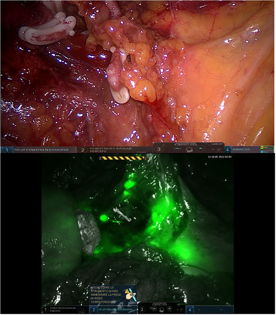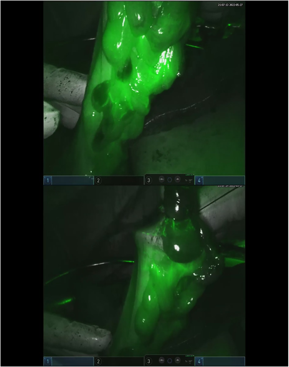 Clinical data, intraoperative observations, and postoperative outcomes were prospectively recorded in a dedicated Excel database. The primary outcomes assessed were the feasibility and safety of ICG use for lymph node mapping and perfusion evaluation. Comparative analyses between the two groups focused on total and positive lymph nodes retrieved, lymph node ratio (LNR), frequency of intraoperative modifications to lymphadenectomy, and incidence of clinically evident anastomotic leakage (Figures 2, 3).