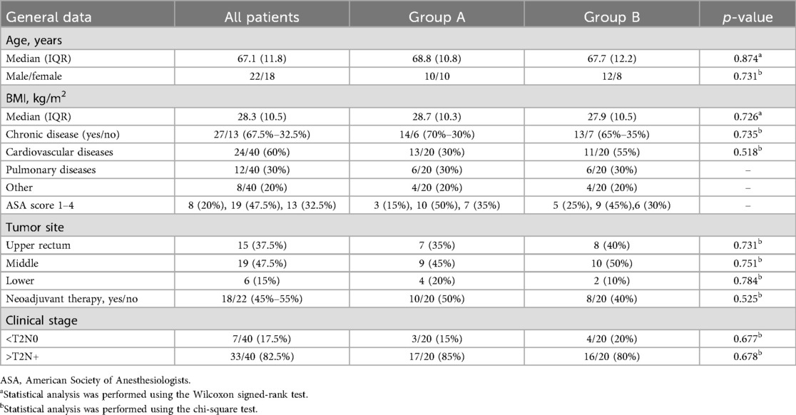 Forty patients (22 males and 18 females) were enrolled in the study. Patients were equally distributed between the two groups, with no significant differences in baseline characteristics. The baseline characteristics of all patients are reported in Table 1.