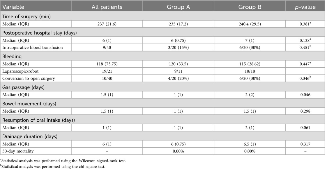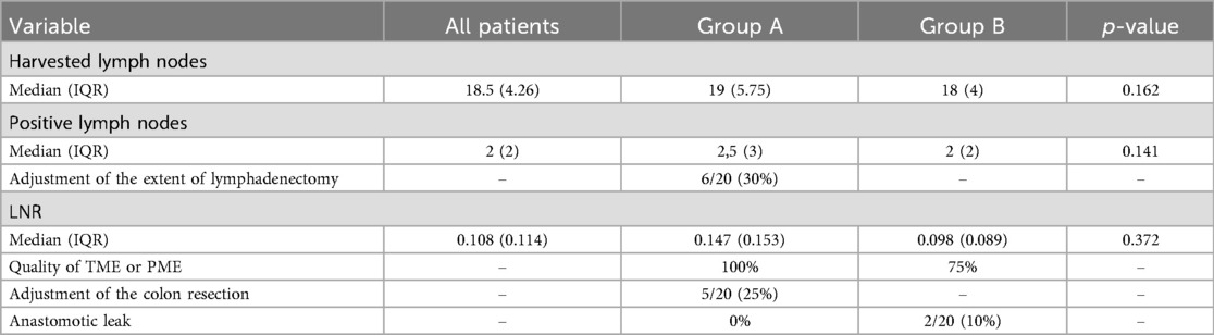 The median number of harvested and positive lymph nodes was slightly higher in Group A (19) than that in Group B (18), although the difference was not statistically significant (p = 0.162). Notably, in 30% of cases in Group A, the extent of lymphadenectomy was adjusted intraoperatively based on ICG fluorescence guidance. No difference in LNR was found between the groups (p = 0.372). The quality of total mesorectal excision (TME) or partial mesorectal excision (PME) was optimal in 100% of patients in Group A, compared to 75% in Group B. In the remaining five cases from Group B, the quality of excision was classified as grade 2 according to the Quirke classification (8). Oncologic margins were also assessed in both groups. The circumferential resection margin (CRM) and distal resection margin were free of tumor involvement in all cases, with no significant differences observed between Group A and Group B.