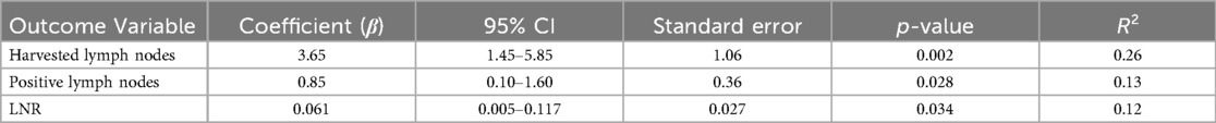 Linear regression analyses demonstrated that ICG use was significantly associated with an increased number of harvested lymph nodes (β = 3.65, 95% CI: 1.45–5.85, p = 0.002), a higher number of positive nodes (β = 0.85, p = 0.028), and a greater LNR (β = 0.061, p = 0.034). These findings support the hypothesis that ICG-guided mapping may enhance nodal yield and detection (Table 4).