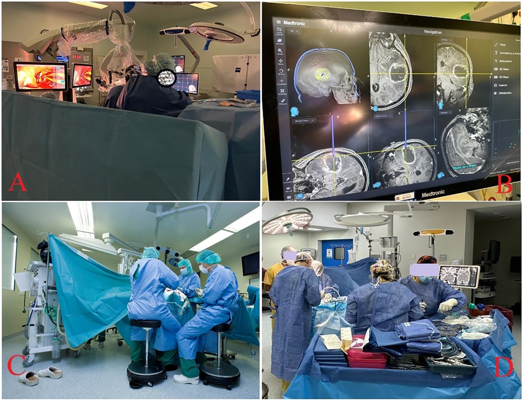 Figure 1. Technological integration in neurosurgery training. (A,B) Advanced image-guided neurosurgical setup. Panel (A) shows the integration of surgical microscopes, intraoperative displays, and navigation systems, while Panel (B) offers a close-up of the neuronavigation interface used for trajectory planning and real-time localisation during cranial procedures. (C) Adjustable stools, optimal posture, and microscope positioning during prolonged neurosurgical procedures. (D) The array of TEC that require procedural familiarity.