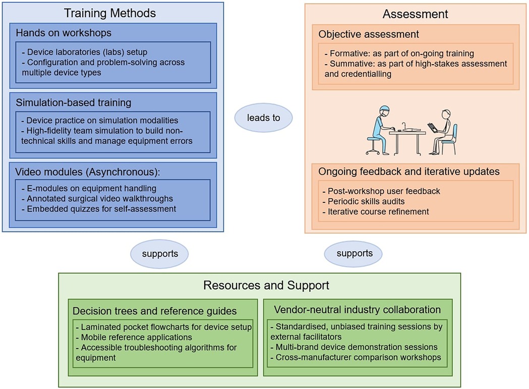 Improving TEC training does not require a complete overhaul of existing SBT practices. Instead, adopting a whole-task approach (21), where trainees engage in the full procedural workflow including TEC selection, setup, troubleshooting, and post-operative steps, can enhance both TEC fluency and contextual understanding. SBT that replicates real clinical sequences—such as patient preparation, anaesthetic administration, and equipment configuration—helps embed technical skills within the cognitive and technological demands of modern surgery (22). This approach supports the development of transferable skills (23) and reduces the risk of TEC-related errors during live procedures. Structured exposure to TEC challenges in a low-pressure, controlled environment allows trainees to better anticipate and manage problems as they arise. Transitioning from isolated task training to full-context procedural simulation also aligns with constructivist learning theory (13) and better prepares surgeons for independent practice in technology-rich operative settings. Consistent with prior research linking TEC-handling competence to fewer adverse events and improved workflow efficiency, our findings support the inclusion of TEC-specific simulation within patient safety curricula (24).The proposed TEC Toolkit, comprising hands-on SBT, multidisciplinary workshops, and digital resources, offers a targeted and theory-informed solution. Rooted in constructivist learning theory and guided by Kern's six-step curriculum development framework, the toolkit positions TEC literacy as a core, assessable competency. By providing regular, protected opportunities for simulated TEC practice, it aims to reduce cognitive burden (24) in the modern OT, enhance operative confidence, and improve safety.