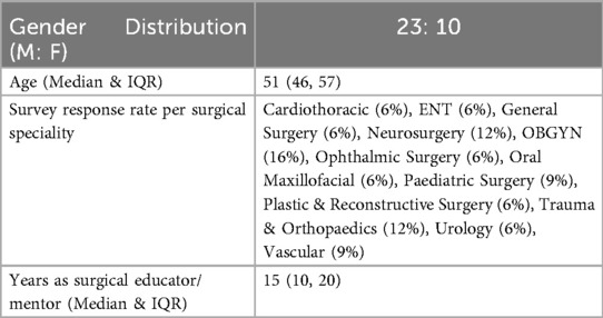 This study used a mixed methods design, incorporating both quantitative and qualitative components. A national survey was conducted among surgical educators across 12 surgical specialties in the RoI to evaluate current practices, perceived needs, and support for TEC training. All participants were recruited through purposive sampling (10) and were consultant-level senior surgical educators, currently or formerly serving in roles such as Training Programme Director (TPD) or SBT lead, with direct responsibility for postgraduate training and skills development. For the majority of specialties, invitation and survey administration were coordinated through the administration department of the Department of Surgical Affairs (DoSA) at Royal College of Surgeons Ireland (RCSI), which acts as gatekeeper for these training programmes. Obstetrics and gynaecology (OBGYN), as well as ophthalmic surgery, were included in this survey due to their regular use of the OT and reliance on complex surgical technologies, despite not being among the 10 core surgical specialties formally recognised by the Intercollegiate Surgical Curriculum Programme (ISCP) (11). OBGYN educators were recruited in coordination with the Royal College of Physicians of Ireland (RCPI), which governs postgraduate specialist training in these disciplines. Ophthalmic surgical educators were recruited in coordination with the Irish College of Ophthalmology (ICO). This approach ensured comprehensive access to relevant consultant educators across both colleges and all major surgical specialties. This study was granted ethical approval by the Ethics Committee of RCSI University of Medicine and Health Sciences (review code 202507013). Participation was voluntary and implied consent was provided by completion and submission of the anonymous online survey.