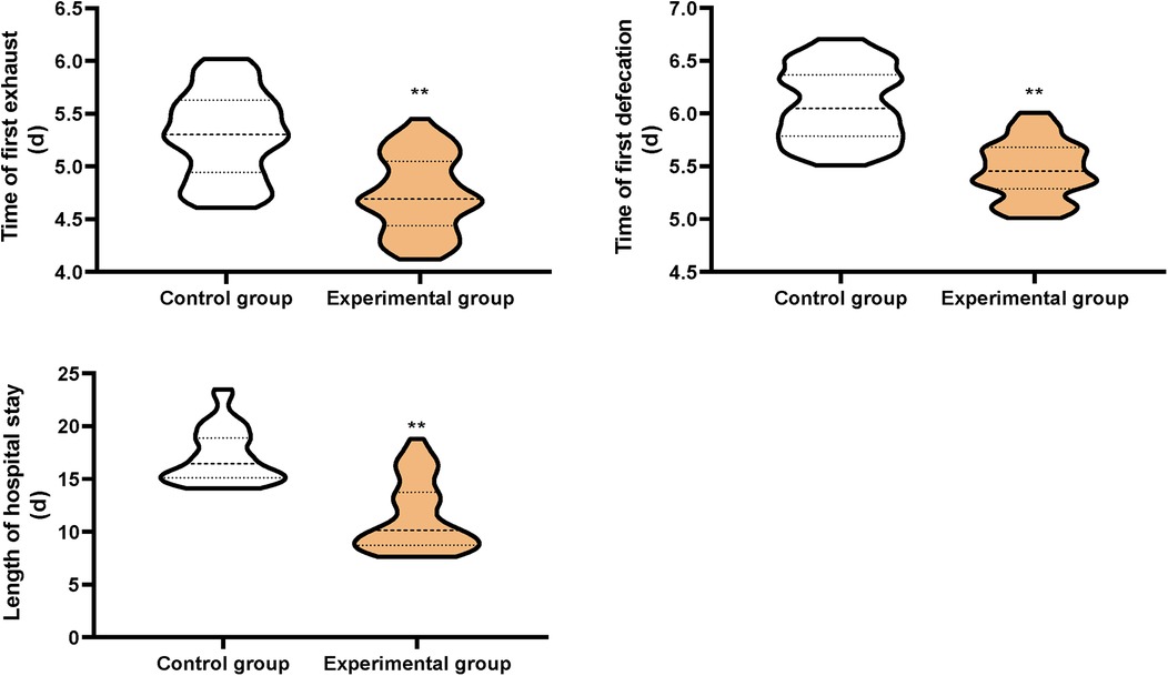 1. The time of first exhaust, the time of first defecation, and the length of hospital stay were compared between the two groups.