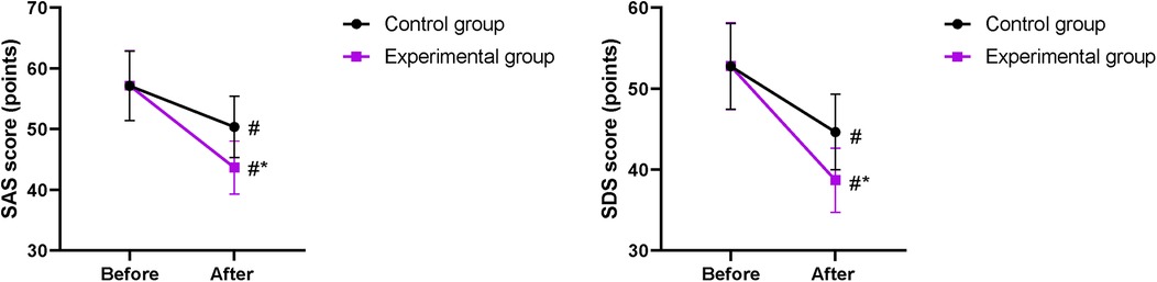 Figure 2. SAS and SDS scores between the two groups. #P < 0.05, compared with before nursing. *P < 0.05, compared with the CG.