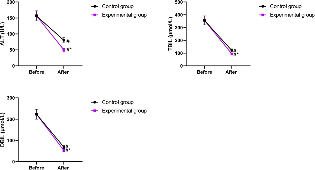Figure 3. Changes in ALT, TBIL, and DBIL levels between the two groups. #P < 0.05, compared with before intervention. *P < 0.05, compared with the CG.