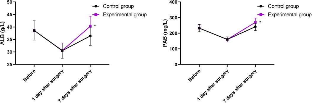Serum ALB and PAB levels in both groups on the first day after operation significantly decreased compared with those before operation, but the difference between the two groups was not statistically significant (P > 0.05). Serum ALB and PAB levels increased in both groups on the 7th day of treatment, and those in the EG were higher compared with those in the CG (P < 0.05, Figure 4).