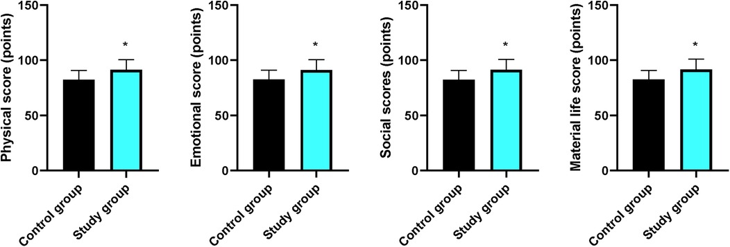 Compared with the CG, the scores for physical, emotional, social, and material life in the EG were higher (P < 0.05, Figure 6).