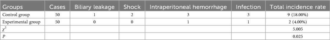 3. The incidence of complications, including biliary leakage, shock, intraperitoneal hemorrhage, and infection, was compared between the two groups.