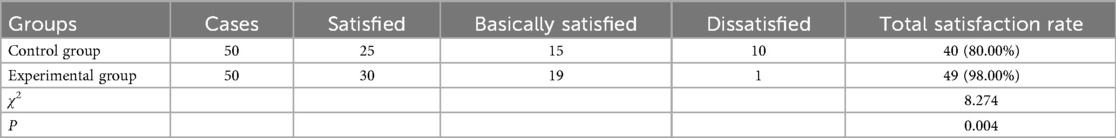8. The self-designed nursing satisfaction questionnaire was used to compare the satisfaction of patients in the two groups with nursing work. The full score of the questionnaire was 100 points, with satisfaction being 85–100 points; basic satisfaction, 70–84 points; and less than 70 points, dissatisfied. Total satisfaction rate = satisfaction rate + basic satisfaction rate.