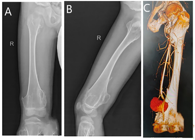 Figure 1. (A) A plain radiograph in the anterior–posterior view reveals an osteochondroma of the right distal femur. (B) A lateral view of the same plain radiograph reveals an osteochondroma of the right distal femur. (C) Computed tomography angiography shows a distal rupture of the right femoral artery with pseudoaneurysm formation.