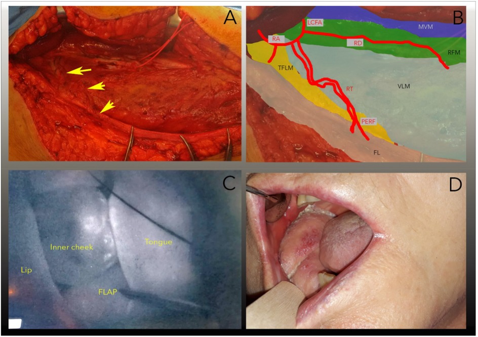 R0 resection was performed under frozen section control leaving a defect of 8 × 6 cm. The final histopathologic diagnosis was pT4a N0 Pn0 L0 V0 G2 OSCC according to UICC 2020. The operation was performed in a two-team approach, one team doing the tumor resection and one harvesting the ALT flap. Intraoperatively, no skin perforators of the descending branch of the LCFA were identified during careful dissection at 2.8× magnification. Proximal dissection revealed that all branches of the LCFA ascended from a proximal anastomotic ring (as shown in Figure 1B), including two strong perforators of the lateral branch that perforated the tensor fascia lata muscle, allowing the ascent of a fasciocutaneous flap for the planned reconstruction. The two lateral branches could be dissected along with a portion of the anastomotic ring, allowing for safe tissue transfer. Microvascular reanastomosis was performed with 9-0 Ethylon suture (Johnson & Johnson) using a Pentero surgical microscope (Zeiss). After successful tissue transfer, blood circulation was monitored with intravenous indocianine green solution (0.3 mg/kg) using the integrated fluorescence camera of the surgical microscope. Postoperative follow-up was uneventful. The flap remained viable with satisfactory healing at the recipient site, and no donor-site morbidity was observed. At four weeks, intraoral healing was complete. Clinical follow-up continued at three and six months, confirming stable flap integration, adequate mandibular contour with plate reconstruction, and absence of complications. The patient reported acceptable oral function for mastication and speech, with gradual improvement over time, and expressed overall satisfaction with the reconstructive outcome. No adverse or unanticipated events were recorded. Figure 1A shows the intraoperative situs, 1B the schematic drawing of the vascular anatomy, 1C the blood circulation under indocianine green fluorescence imaging, and 1D the clinical situation after a four-week healing period.