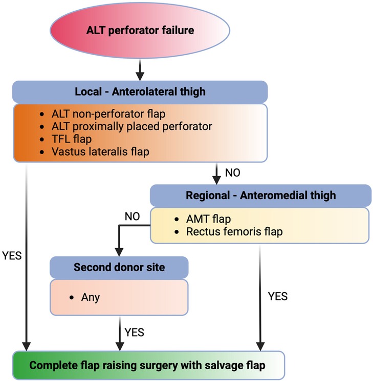 Figure 2. Illustration of the intraoperative decision algorithm for ALT skin perforator failure with possible options for flap salvage. TFL, tensor fascia lata; AMT, anteromedial thigh.