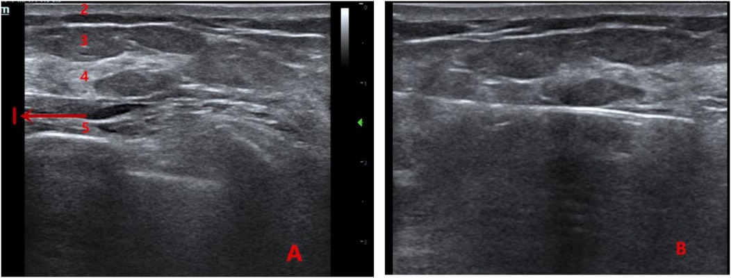 A tumescent local anesthetic solution was prepared by mixing 10 mL of 2% lidocaine hydrochloride, 50 mL of normal saline, and 0.1 mL of 1:1,000 epinephrine. Patients were positioned appropriately, and the skin was disinfected with povidone-iodine. Local infiltration anesthesia was first administered at the puncture site using a syringe, followed by subcutaneous superficial anesthesia. Under ultrasound guidance, additional anesthetic was injected incrementally while advancing the needle until the tip reached the retromammary space beneath the nodule. A sudden reduction in injection resistance indicated correct placement. A larger volume of tumescent anesthetic was then infused to expand the retromammary space, preparing the site for excision.