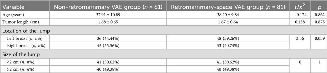 The comparison of general clinical characteristics (age, tumor length, lesion location, and lesion size) between the non-retromammary VAE group and the retromammary-space VAE group is shown in Table 1. No statistically significant differences were observed between the two groups (n refers to the number of patient cases).