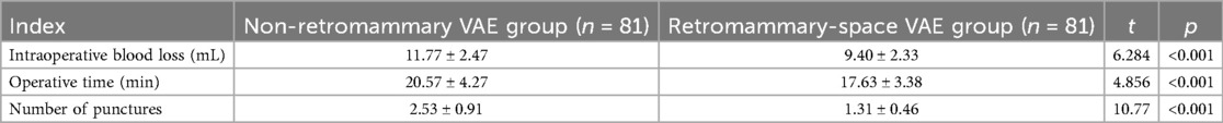 Results: Compared with non-retromammary VAE, retromammary-space VAE demonstrated statistically significant advantages (P < 0.05) in key parameters, including shorter operative time, less intraoperative blood loss, fewer punctures, and a lower incidence of postoperative complications. Subgroup analysis revealed that the 0–2 cm group had shorter operative time and less blood loss than the 2–3 cm group (P < 0.05), while the number of punctures did not differ significantly between groups (P > 0.05).