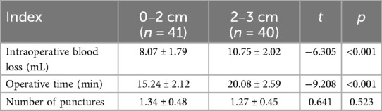 The results of the multivariate analysis showed that, after adjusting for confounding factors such as age, lesion location (left/right), and ultrasound classification, the 0–2 cm subgroup demonstrated advantages over the 2–3 cm subgroup in terms of intraoperative blood loss (OR = 2.39) and operative time (OR = 2.54), indicating that smaller nodules are associated with higher safety and efficiency (P < 0.05), as shown in Table 7.