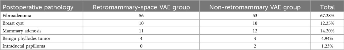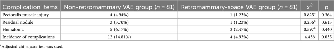 The incidence of postoperative complications in the retromammary-space VAE group was 4.93%, including 1 case of pectoralis muscle injury, 1 case of residual nodule at 3-month follow-up, and 2 cases of postoperative hematoma. In the non-retromammary VAE group, the incidence was 14.81%, including 4 cases of pectoralis muscle injury, 3 cases of residual nodule at 3-month follow-up, and 5 cases of postoperative hematoma. The difference between the two groups was statistically significant (Table 4).
