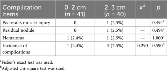 In the retromammary-space VAE group, the incidence of postoperative complications was 2.4% in the 0–2 cm subgroup, including 1 case of hematoma, and 7.5% in the 2–3 cm subgroup, including 1 case of pectoralis muscle injury, 1 case of residual nodule at 3-month follow-up, and 1 case of hematoma. Although the 0–2 cm subgroup had a lower incidence of complications than the 2–3 cm subgroup, the difference was not statistically significant (P > 0.05; Table 5).